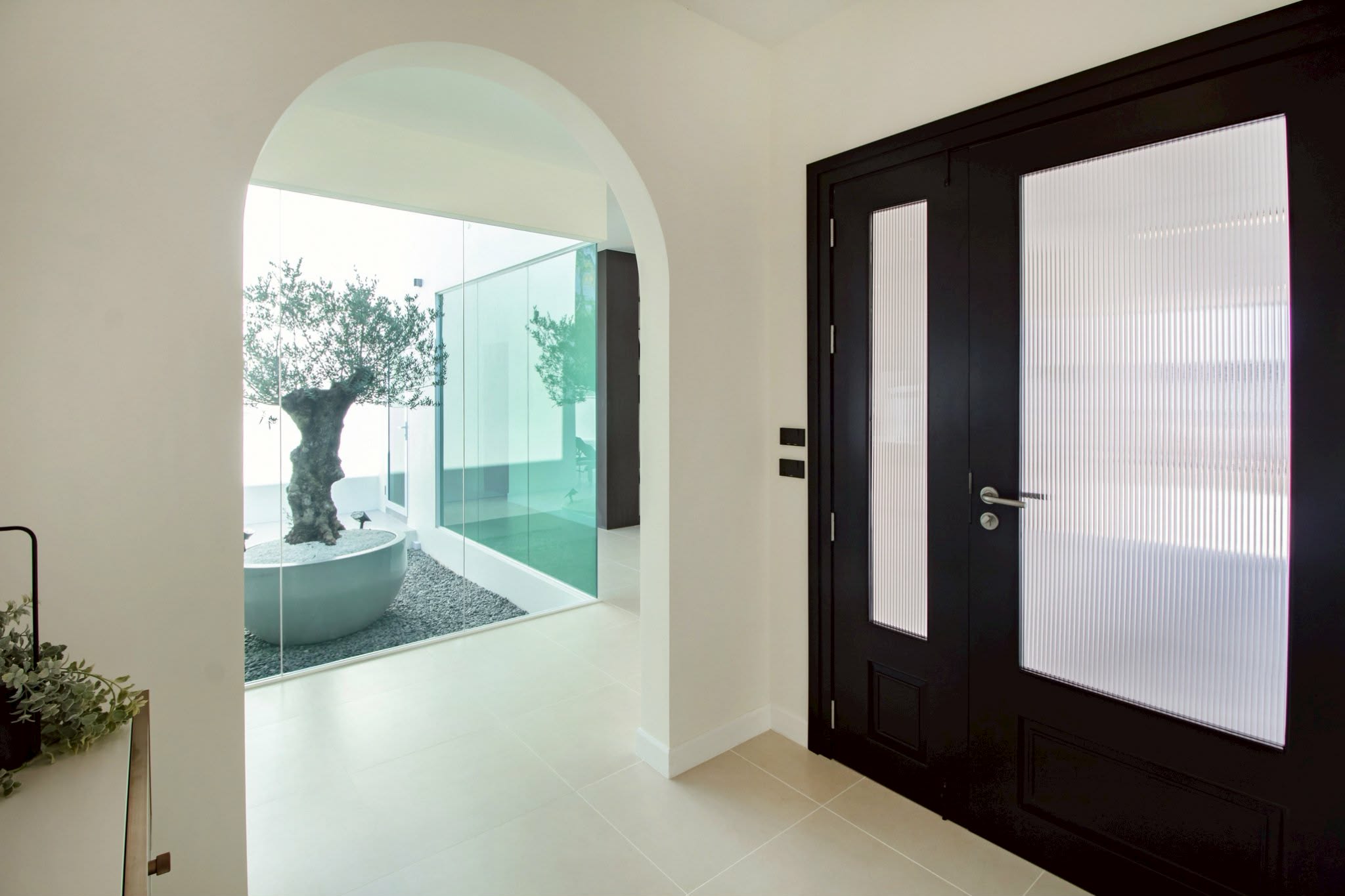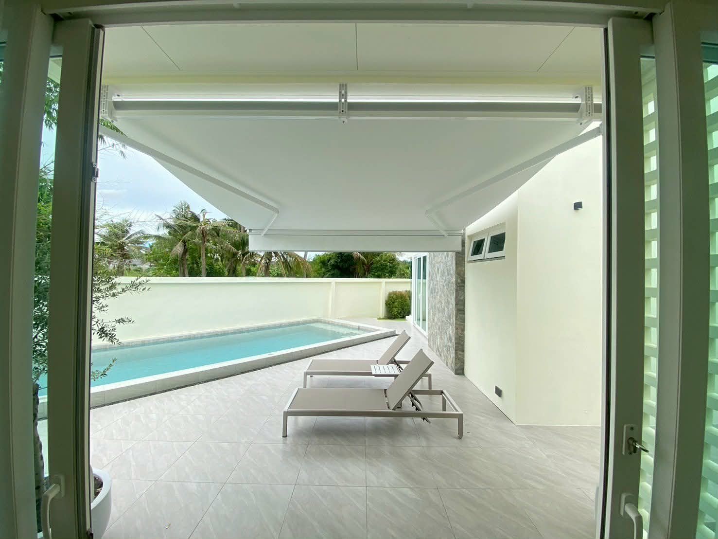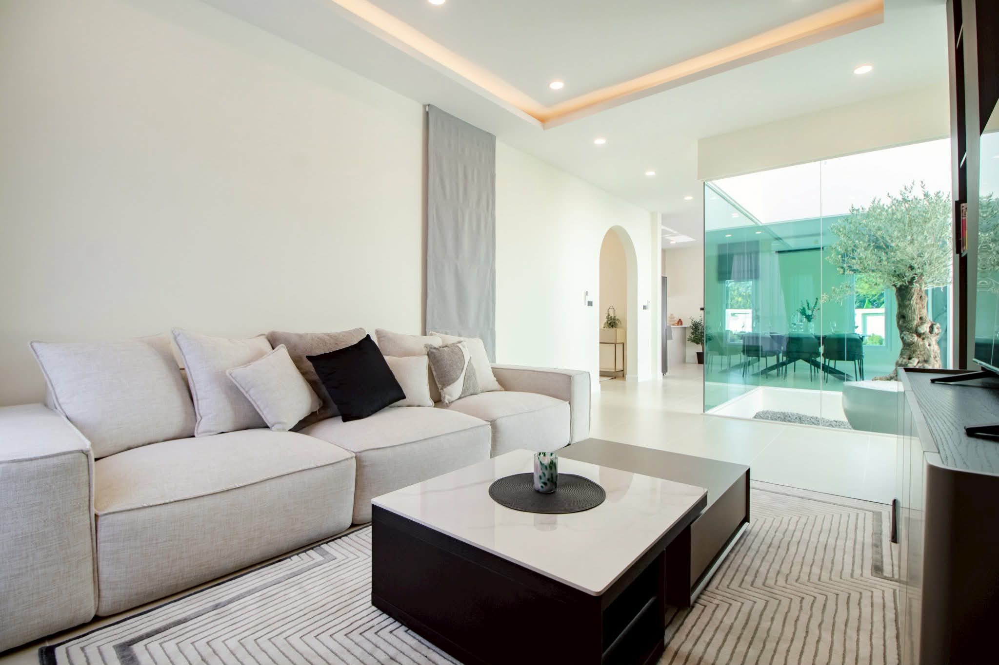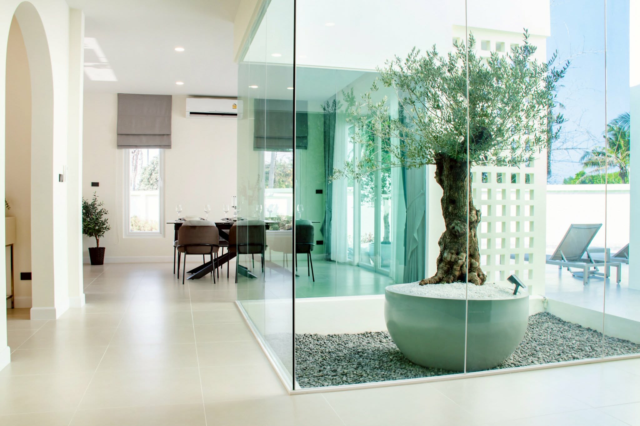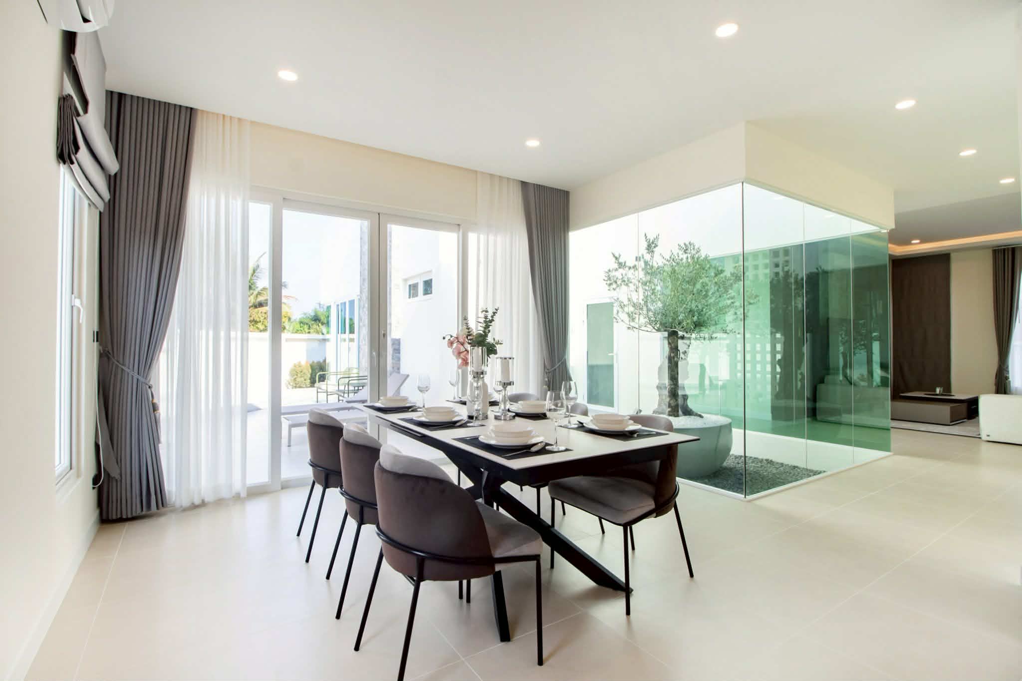 pool villas and thoughtful design,a modern living with a glass courtyard in